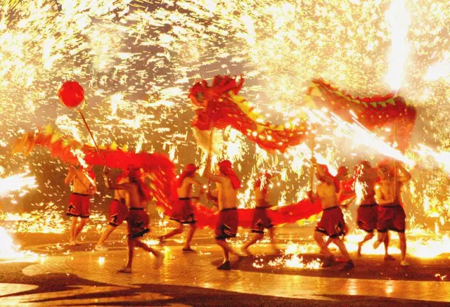 ?舞龍燈也是元宵節(jié)慶典的重要民俗之一。最早見于文字記載的龍舞,是漢代張衡的《西京賦》,作者在百戲的鋪敘中對龍舞作了生動的描繪。而據(jù)《隋書?音樂志》記載,隋煬帝時類似百戲中龍舞表演的《黃龍變》也非常精彩,龍舞流行于中國很多地方。中華民族崇尚龍,把龍作為吉祥的象征。