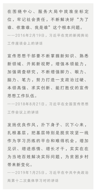 2016年2月19日,習(xí)近平總書記到人民日?qǐng)?bào)社、新華社、中央電視臺(tái)等3家中央新聞單位進(jìn)行實(shí)地調(diào)研,隨后主持召開黨的新聞?shì)浾摴ぷ髯剷?huì)。在座談會(huì)上,習(xí)近平用48字概括了黨的新聞?shì)浾摴ぷ鞯穆氊?zé)和使命:高舉旗幟、引領(lǐng)導(dǎo)向,圍繞中心、服務(wù)大局,團(tuán)結(jié)人民、鼓舞士氣,成風(fēng)化人、凝心聚力,澄清謬誤、明辨是非,聯(lián)接中外、溝通世界。