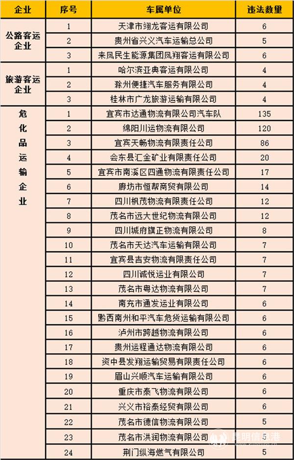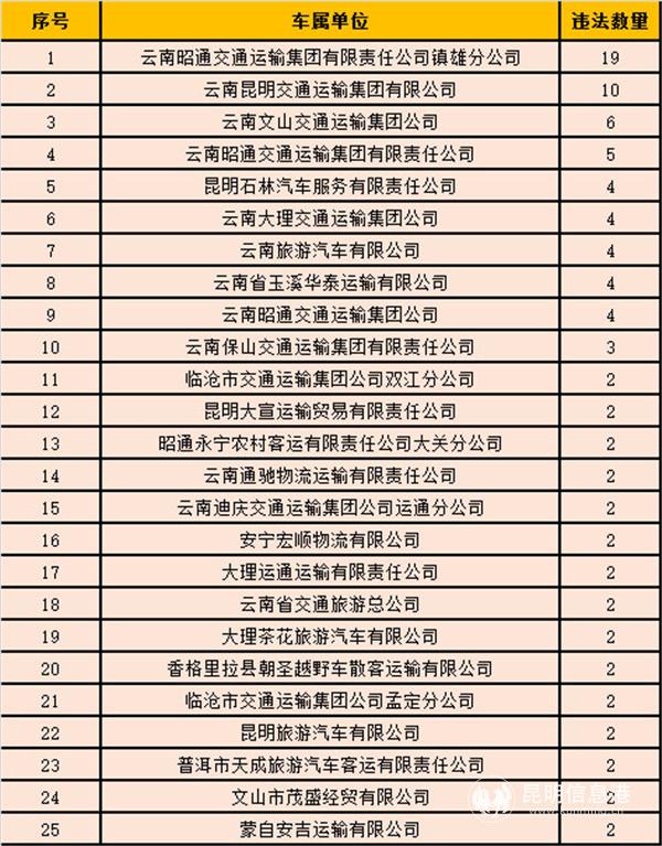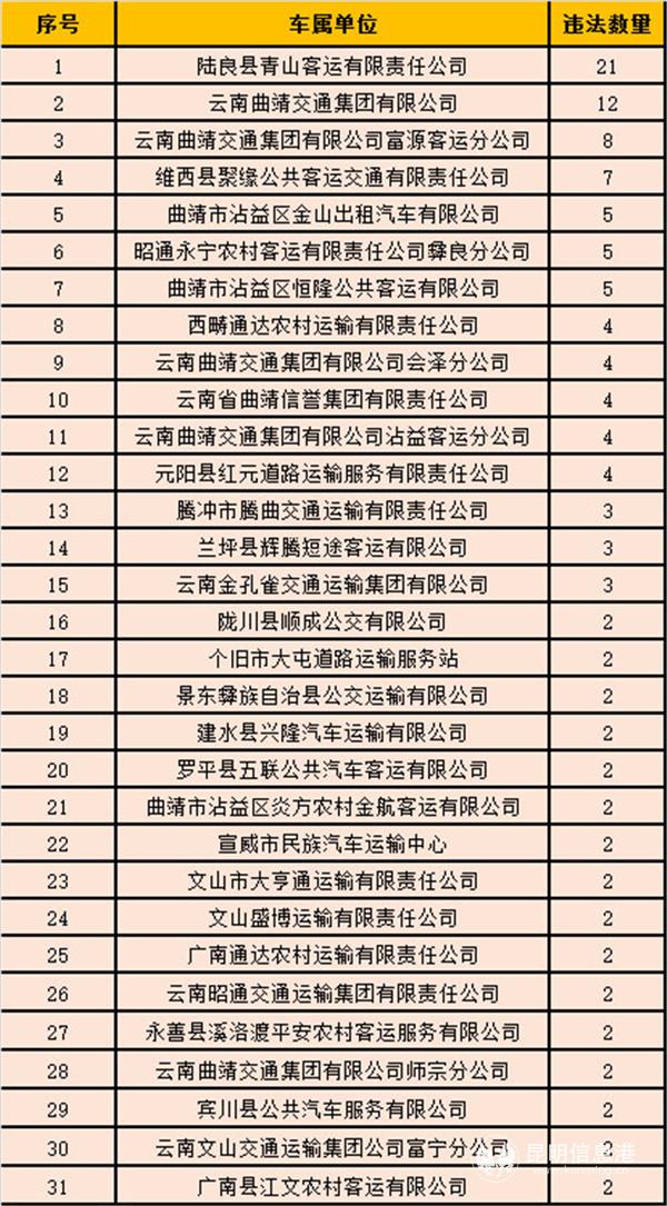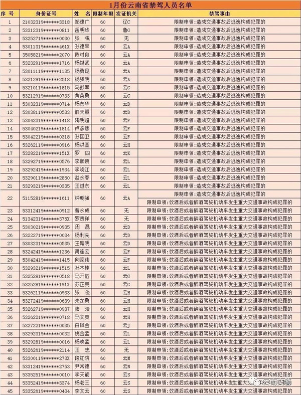 昆明信息港訊 記者黃彩英 近日,云南交警曝光1月全省終生禁駕人員名單,以及違法突出的“兩客一危”車(chē)輛所屬運(yùn)輸企業(yè)。1月全省共有45人受到終生禁駕的嚴(yán)厲處罰,查處“兩客一?!避?chē)輛交通違法1300起。