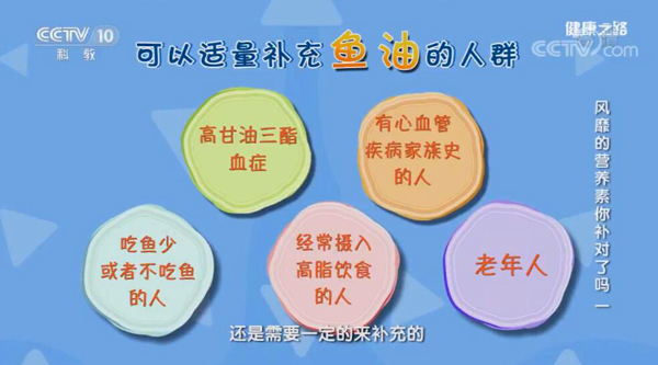 哪些人群可以適量補(bǔ)充魚油呢?劉英華表示,一是高甘油三酯血癥人群。這類人需要補(bǔ)充魚油來輔助降低甘油三酯的濃度;二是有心血管疾病家族史的人。他們可以適當(dāng)補(bǔ)充魚油,來預(yù)防日后發(fā)生冠心病的風(fēng)險(xiǎn);三是吃魚非常少的正常人。這類人不能從食物中攝取足夠的魚油,最好是補(bǔ)充一些魚油來增加歐米茄-3脂肪酸的攝入量;四是經(jīng)常攝入高脂飲食的人。這類人可能會(huì)出現(xiàn)高甘油三酯血癥的風(fēng)險(xiǎn),所以這類人群還是需要適量補(bǔ)充;五是老年人。老年人既需要補(bǔ)充腦,也需要預(yù)防心血管病風(fēng)險(xiǎn),所以DHA和EPA都需要補(bǔ)充,因此老年人比較適合吃魚油。