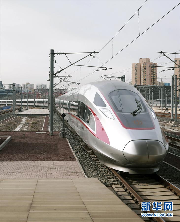 1月5日,超長版時速350公里“復(fù)興號”G9次動車組駛?cè)氡本┠险尽P氯A社發(fā)(陳曉根/攝)