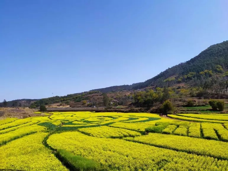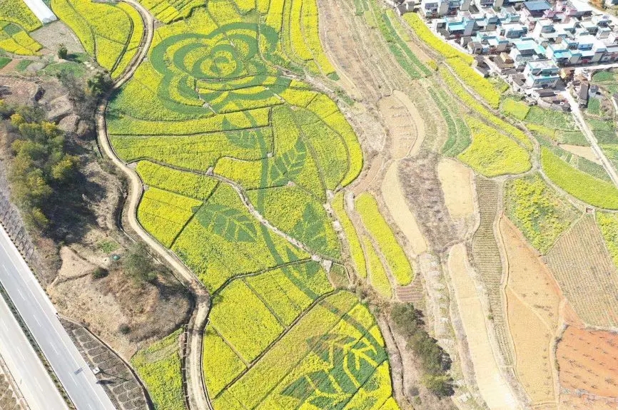 離昆明最近的油菜花賞花地除了安寧螳川這個常規(guī)景點外,今年安寧又多了一處新的網(wǎng)紅打卡點——安寧市縣街街道山口村。如今,這里的核心景觀區(qū)通過栽種時的藝術(shù)指導,連片的90畝油菜花和蠶豆田從空中俯拍下來,呈現(xiàn)出一朵大大的山茶花造型,很是吸引眼球。