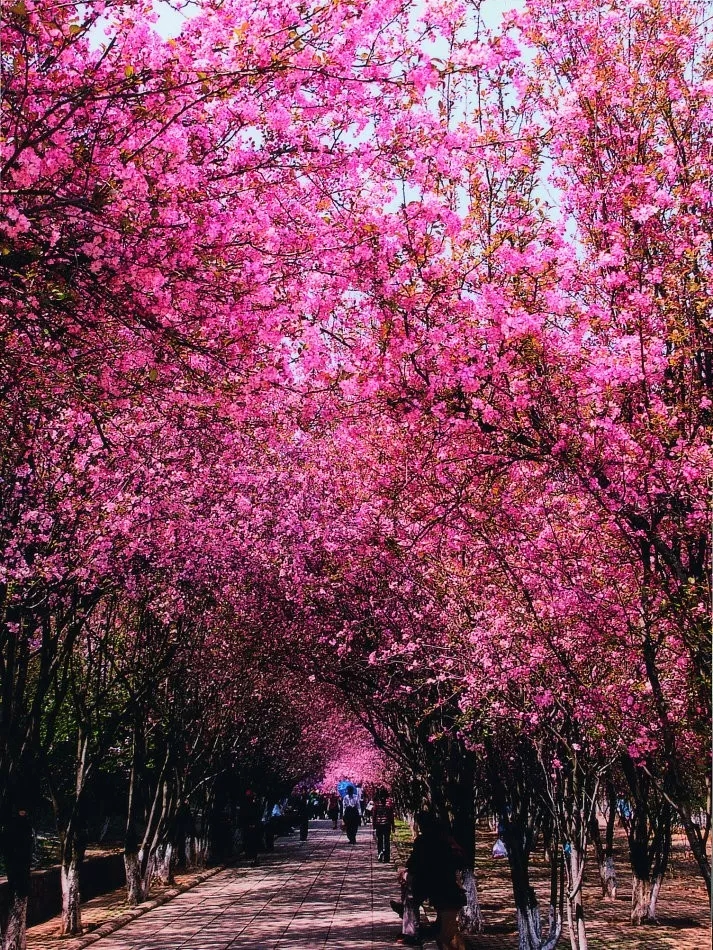 其中,最為著名就是“圓通花潮”,歷史悠久、名揚中外的“圓通花潮”景觀位于昆明圓通山(昆明動物園),分布在高低錯落的山麓之上,由櫻花區(qū)和海棠區(qū)組成,連片成林。由于櫻花和海棠的花期、花色較為接近,所以大家都習慣統(tǒng)稱為櫻花。