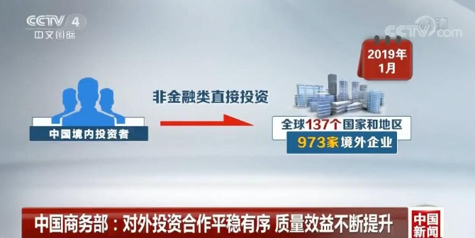 商務(wù)部發(fā)言人 高峰:除了一些國際機構(gòu)預(yù)測今年全球經(jīng)濟增長可能放緩的預(yù)期,一些國家和地區(qū)加嚴(yán)對外國投資的安全審查等因素,也存在偶然性因素。從總體來看,2019年1月,我國對外投資合作的規(guī)模雖然有所下降,但質(zhì)量和效益不斷提升。