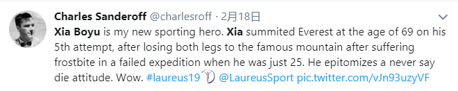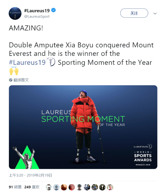 勞倫斯世界體育獎(jiǎng)官方致辭稱,在一年一度的勞倫斯世界體育獎(jiǎng)“最佳體育時(shí)刻”公眾投票中,勵(lì)志的中國(guó)登山者夏伯渝獲得了最多的選票。夏伯渝因他的不懈努力而受到表彰,經(jīng)歷了凍傷、截肢、癌癥、血栓等眾多挑戰(zhàn),他從未放棄與珠峰擁抱的夢(mèng)想!過去四十年,他數(shù)次嘗試登頂。終于,在去年,這一神圣的雪山接納了他。這是 2019勞倫斯世界體育獎(jiǎng)年度最佳體育時(shí)刻獎(jiǎng)得主夏伯渝的故事,向世界展示著中國(guó)人的堅(jiān)毅和信念!