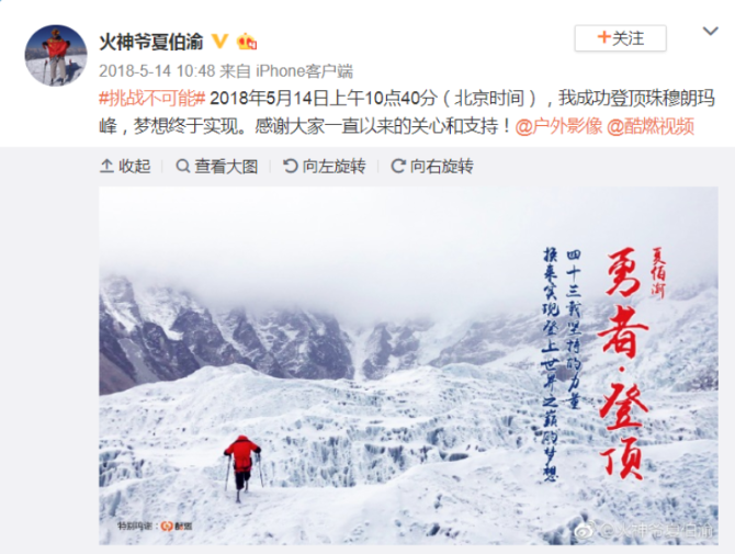 讓我們把時(shí)間線拉回到9個(gè)月前,北京時(shí)間2018年5月14日10時(shí)40分,同樣是踩著一對(duì)假肢,69歲的夏伯渝站在了世界之巔,向世界宣布:“我成功登頂珠穆朗瑪峰,夢(mèng)想終于實(shí)現(xiàn)?!?/p>