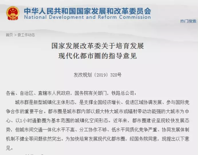 21日,國家發(fā)展改革委對外發(fā)布了關(guān)于培育發(fā)展現(xiàn)代化都市圈的指導(dǎo)意見。意見提,到2022年,都市圈同城化取得明顯進(jìn)展,基礎(chǔ)設(shè)施一體化程度大幅提高,阻礙生產(chǎn)要素自由流動的行政壁壘和體制機(jī)制障礙要基本消除。