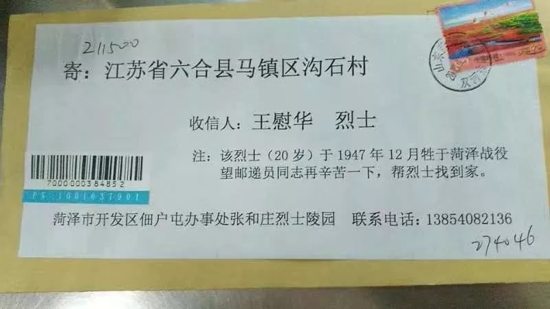 2月20日早上七點(diǎn)半左右,江蘇南京郵政六合區(qū)分公司雄州投遞部收到一封信件,寄往六合縣馬鎮(zhèn)區(qū)溝石村,收件人為“王慰華烈士”,并備注:“該烈士(20歲)于1947年12月犧牲于菏澤戰(zhàn)役,望郵遞員同志再辛苦一下,幫烈士找到家?!?/p>