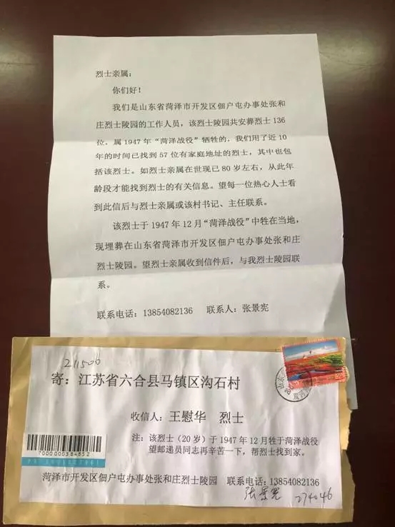 “王慰華烈士在菏考奔襲戰(zhàn)中犧牲,當(dāng)時(shí)他只有20歲。”張景憲說,自己所工作的烈士陵園,當(dāng)時(shí)是一個(gè)臨時(shí)戰(zhàn)地醫(yī)院,因?yàn)閼?zhàn)斗很慘烈,犧牲的人都是就地埋葬,連墓碑都找不到。“10年前,我開始幫館里的烈士尋親,但是因?yàn)槟甏眠h(yuǎn),很多地名更改,一些史料照片上的字跡模糊,尋親工作十分艱難。2013年,我在一個(gè)部隊(duì)軍史館發(fā)現(xiàn)了王慰華的籍貫是六合。這幾年多方尋找,終于查到具體地址?!庇谑撬е唤z希望寄出了這封信。