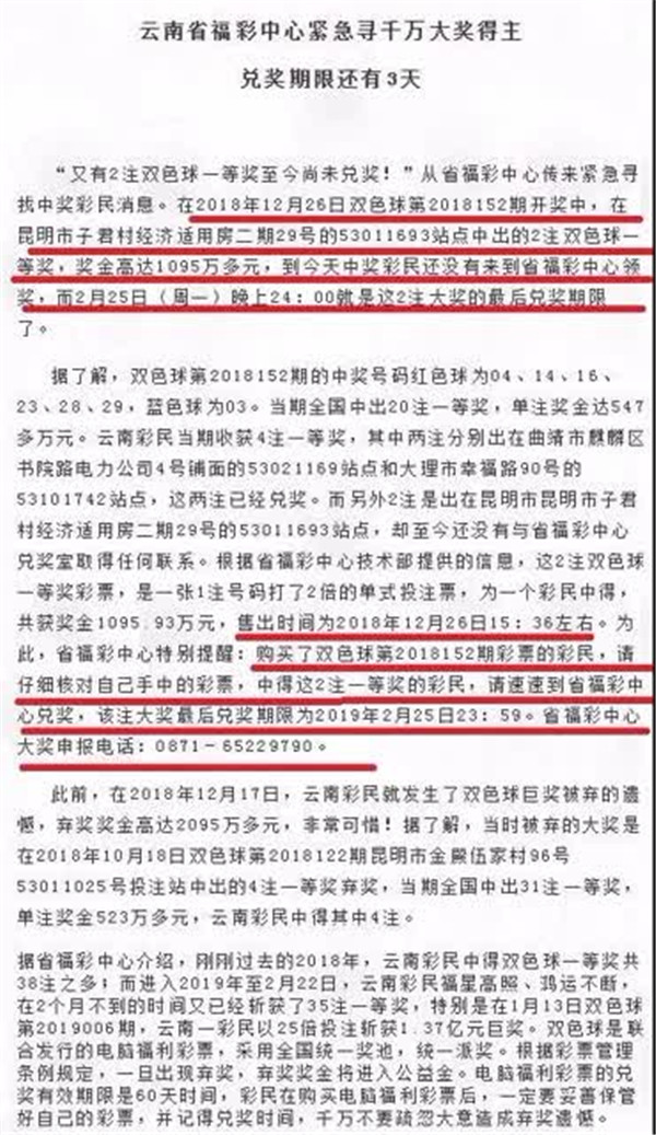 文章里寫明:在2018年12月26日雙色球第2018152期開獎中,昆明市子君村經(jīng)濟(jì)適用房二期29號的53011693站中出的2注雙色球一等獎,獎金高達(dá)1095萬多元,到2月22日中獎彩民都沒有到福彩中心領(lǐng)獎。