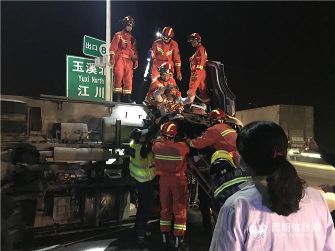 昆明信息港訊 記者勞學(xué)麗 2月24日20時許,昆玉高速昆明至玉溪方向九龍池收費站附近,一輛大貨車、一輛小貨車和一輛面包車發(fā)生三車相撞事故,現(xiàn)場一人被困。當(dāng)晚20時33分,玉溪高新區(qū)消防大隊接到支隊119指揮中心命令,并立即出動2車14人趕赴現(xiàn)場救援。