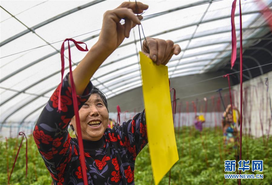 2月24日,在位于深州的河北興泰現(xiàn)代農(nóng)業(yè)園區(qū)溫室大棚內(nèi),工作人員在懸掛粘蟲板。新華社 記者李曉果/攝
