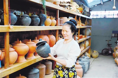 位于曼斗村的玉勐家是一幢傣族干欄式民居。一樓就是她創(chuàng)作、授徒、接待八方來客的地方。沿墻擺放的數個木架上,分別陳列著玉勐在各個時期制作的缸、罐、缽、杯等作品,有紅色、土黃色,還有煙灰色等,顯得古色古香。“要不是政府加大力度挖掘、保護、傳承民族傳統(tǒng)文化,發(fā)展旅游業(yè),我的這項技藝恐怕要失傳了。”玉勐告訴記者,我州一直大力發(fā)展旅游業(yè),游客不斷增多,為她的慢輪制陶作坊帶來了新的生機。