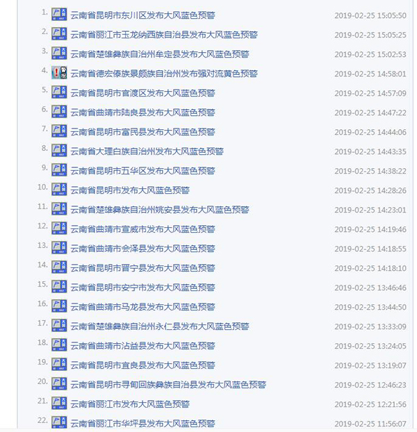 同時,記者從中國天氣預(yù)警信息中發(fā)現(xiàn),云南省共有21條大風(fēng)藍(lán)色預(yù)警信息,包括昆明市東川區(qū)、麗江玉龍縣、楚雄牟定縣、昆明市官渡區(qū)、曲靖市陸良縣、昆明市富民縣、大理州、昆明市五華區(qū)、昆明市、楚雄姚安縣、曲靖宣威市、曲靖會澤縣、昆明晉寧縣、昆明安寧市、曲靖馬龍縣、楚雄永仁縣、曲靖沾益縣、昆明宜良縣、昆明尋甸縣、麗江市、麗江華坪縣發(fā)布大風(fēng)藍(lán)色預(yù)警信息。