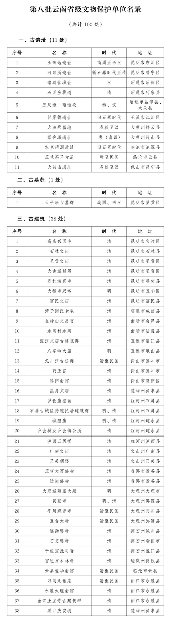 昆明信息港訊 記者昝娟娟 近日,云南省政府公布第八批省級(jí)文物保護(hù)單位,共計(jì)100處。玉碑地遺址等11處古遺址,天子廟古墓群1處古墓葬,高廟興國(guó)寺等38處古建筑,冰心默廬等45處近現(xiàn)代重要史跡及代表性建筑,為疆界滇、蜀各有攸分等事碑等5處石窟寺及石刻入選。