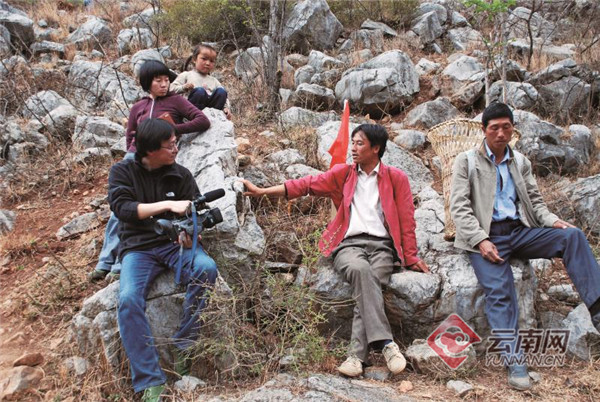 2010年,馬路鄉(xiāng)岔河村抗旱期間,熊成富在背水途中接受中央電視臺記者采訪