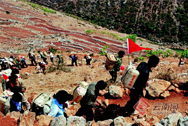 剛下村的第一天,熊成富就動員大家:“我們?nèi)彼荒苋本瘢?,到山腳下的牛欄江背水來吃?!彼称疣l(xiāng)上發(fā)的抗旱水桶,帶領群眾開始了艱辛的背水路。岔河小組143人中,有部分老弱病殘、鰥寡孤獨老人,飲水極度困難。熊成富帶領村組干部,建立“包保責任制”,親自包戶,每3天給老人送50斤水,確保老人有水喝。