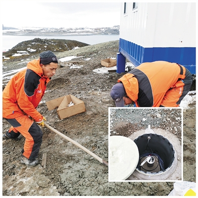 科考隊(duì)員挖掘觀測(cè)儀器安放坑。小圖為南極地震臺(tái)站觀測(cè)儀器安放坑。圖片由中國(guó)地震局地球物理研究所提供