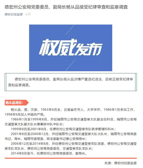 德宏州公安局黨委委員、副局長楊從品涉嫌嚴(yán)重違紀(jì)違法,目前正接受紀(jì)律審查和監(jiān)察調(diào)查。