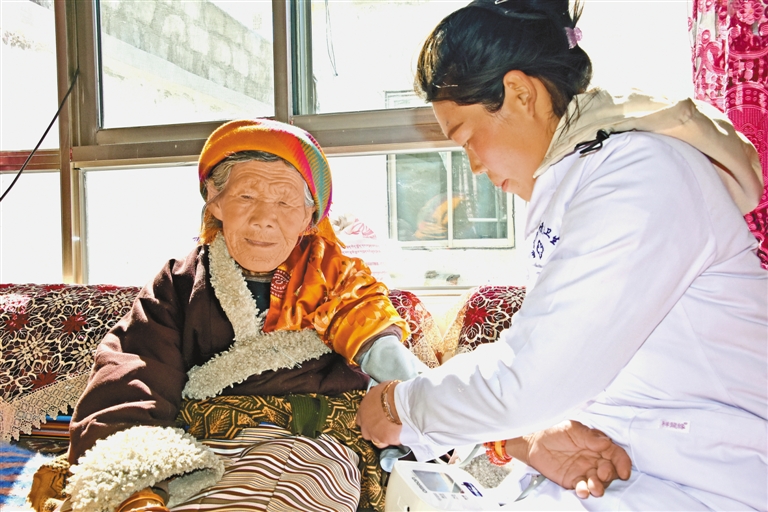 圖為三有村衛(wèi)生室醫(yī)務(wù)人員德慶拉姆上門為桑珠卓瑪檢查身體。 記者劉斯宇/攝