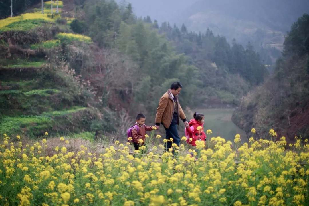 潘平忠老師送孩子們回家時(shí)經(jīng)過(guò)一片油菜花田。