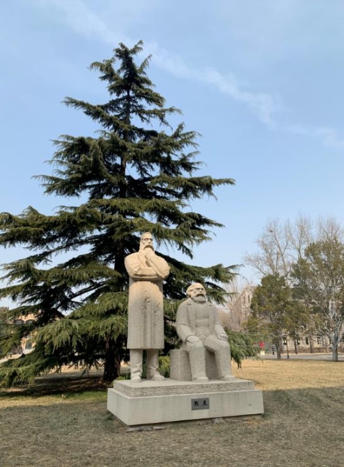 △上午八點(diǎn)半,正在陸續(xù)入場的學(xué)員們。在他們不遠(yuǎn)處屹立著毛澤東雕像。(央視記者張曉鵬拍攝)