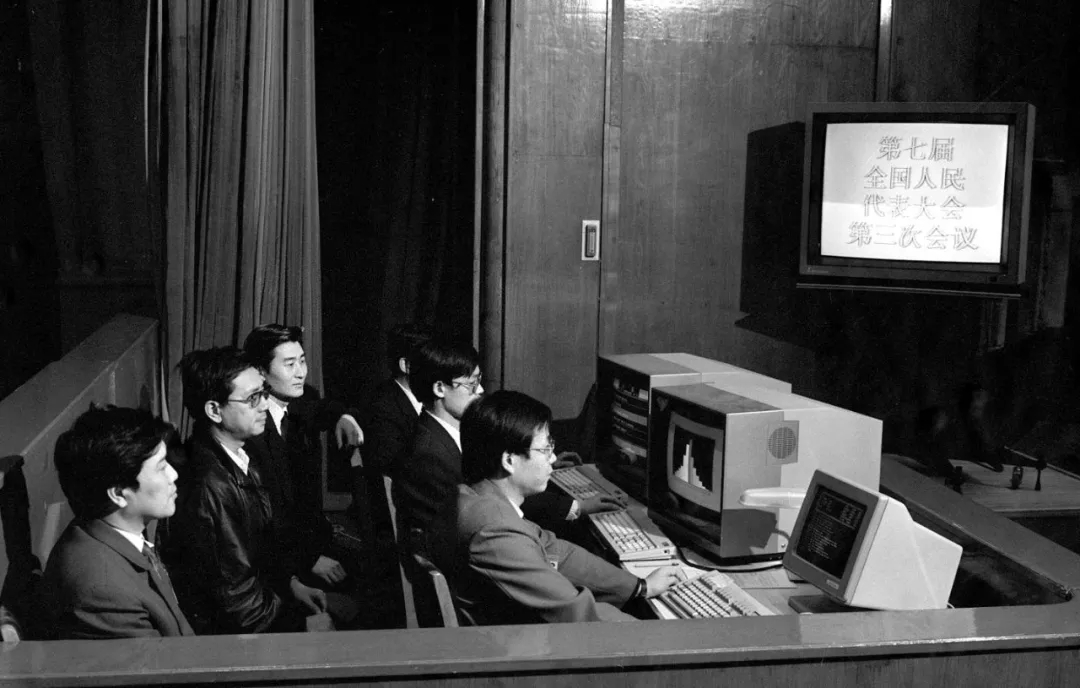 1990年3月,工作人員在七屆全國人大三次會議上監(jiān)視電子表決系統(tǒng)的運轉(zhuǎn)情況。這套電子表決系統(tǒng)有報到、表決和即席發(fā)言3種功能。(新華社記者湯孟宗攝)
