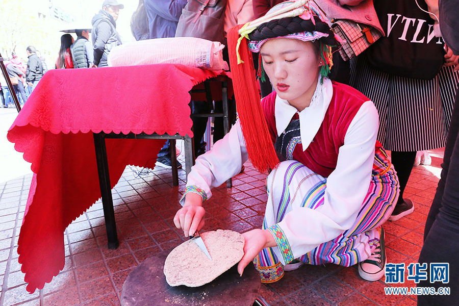 現(xiàn)場制作石板粑粑。新華網(wǎng)范芳鈺/攝