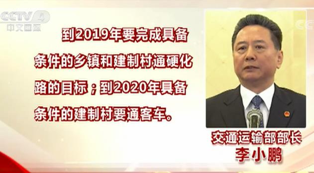 在2018年3月5日的兩會(huì)“部長(zhǎng)通道”上,交通運(yùn)輸部部長(zhǎng)李小鵬表示,到2019年要完成具備條件的鄉(xiāng)鎮(zhèn)和建制村通硬化路的目標(biāo),到2020年具備條件的建制村要通客車(chē)。