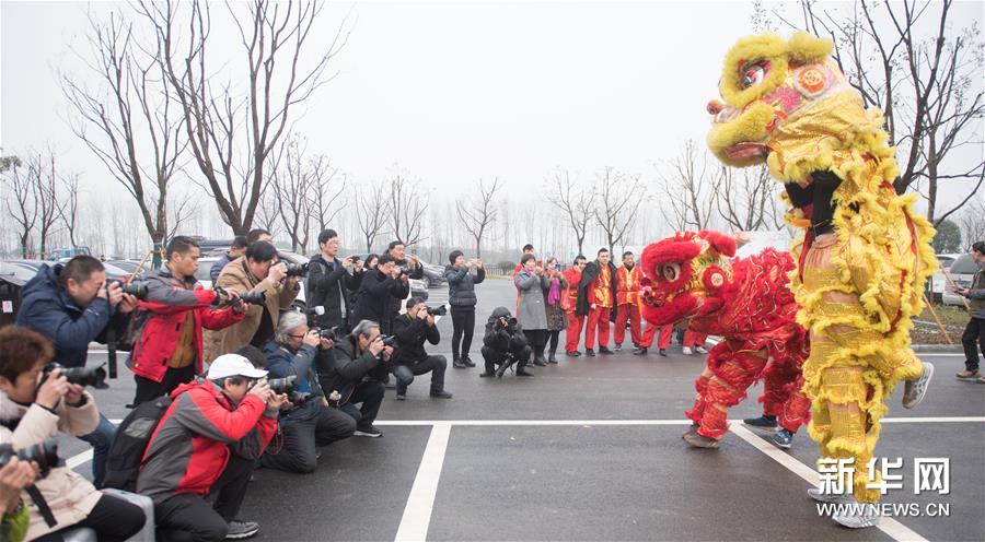 3月3日,攝影愛好者在菰城村拍攝舞獅表演。 新華社記者翁忻旸/攝