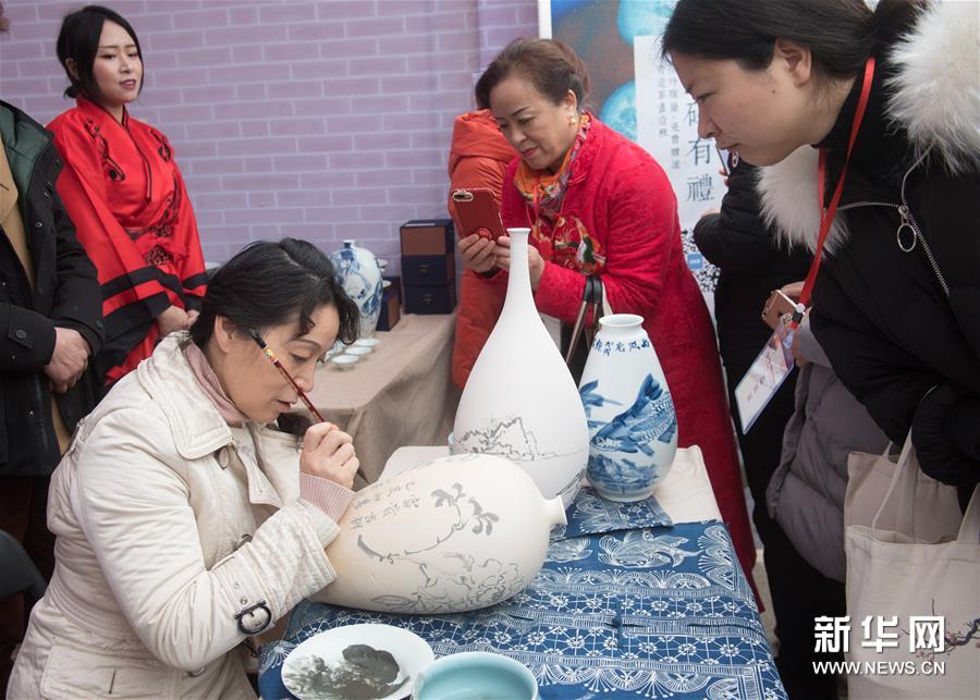 3月3日,人們在菰城村觀看陶藝家繪制青瓷花瓶。新華社記者翁忻旸/攝