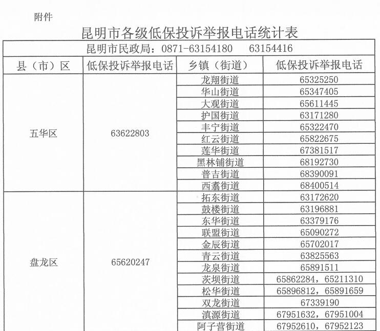 昆明信息港訊 記者周碩 為了杜絕“人情?!薄瓣P(guān)系?!焙拓澪矍终?、截留挪用低保金等違法違紀(jì)問題,按照《云南省民政廳關(guān)于進(jìn)一步嚴(yán)格規(guī)范管理推進(jìn)陽光低保的若干規(guī)定》(下稱《規(guī)定》)要求,昆明市現(xiàn)將各縣區(qū)、鄉(xiāng)鎮(zhèn)街道的低保投訴電話進(jìn)行公布,方便受理群眾的咨詢和投訴舉報(bào)。