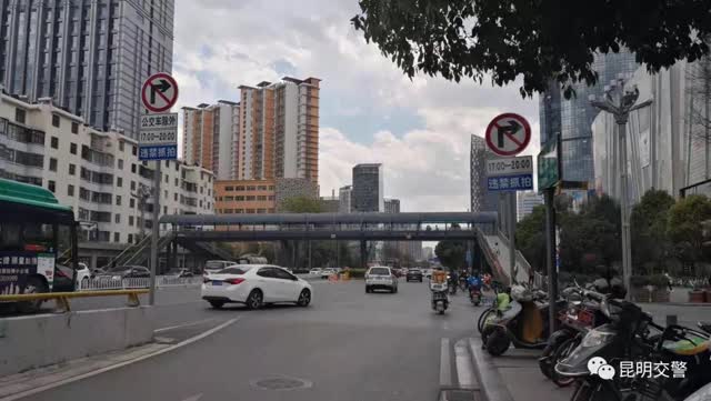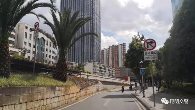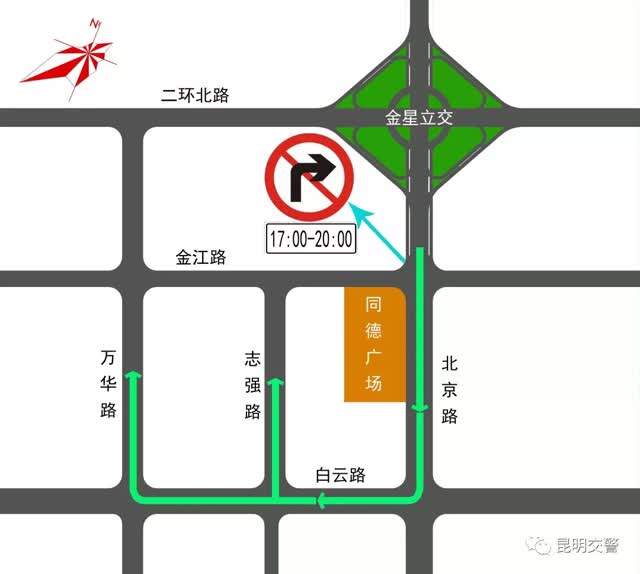 為切實緩解片區(qū)交通擁堵問題,昆明交警對北京路與金江路交叉路口進行了交通組織優(yōu)化,采取“限時禁右”的交通管理措施。即:在每日晚(17:00至20:00)交通高峰時段禁止北京路由北向南由金星立交駛來的機動車輛(含底層環(huán)島及二層橋面)右轉(zhuǎn)進入金江路。
