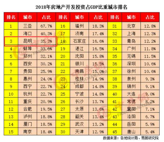 ?報告顯示,在45個大中城市中,2018年云南房地產(chǎn)開發(fā)投資占GDP總量的18.2%,在全國排名第四;2018年房地產(chǎn)開發(fā)投資占GDP比重排名前三位的城市依次是三亞、??诤屠ッ?昆明市房地產(chǎn)開發(fā)投資占GDP比重為35.3%,排在第三位。易居研究院認為,三亞、海口和昆明的經(jīng)濟之所以對房地產(chǎn)的依賴度過高,主要是產(chǎn)業(yè)結構不合理造成的。其中,海南省政府已多次出臺嚴厲調(diào)控政策,三亞對房地產(chǎn)的依賴正在逐漸下降,但房地產(chǎn)開發(fā)投資對于全市的經(jīng)濟貢獻依然高達近七成。昆明的情況也非常相似,昆明市經(jīng)濟對房地產(chǎn)的高依賴度也持續(xù)了多年。