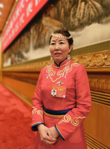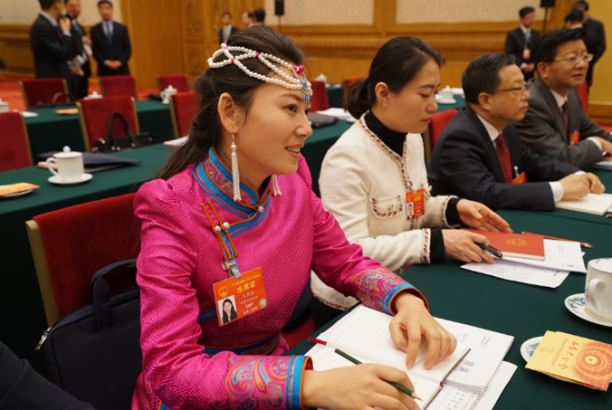 習(xí)近平走進(jìn)會場后,鄂溫克族代表梅花向他獻(xiàn)上了藍(lán)色的哈達(dá)。這是梅花代表。(央視記者張曉鵬拍攝)