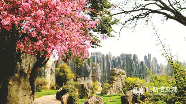 昆明信息港訊(昆明日?qǐng)?bào) 記者李思凡)陽(yáng)春三月,石林景區(qū)里紫葉李、迎春、玉蘭、山茶、櫻花、杜鵑、垂絲海棠、三葉堇等花卉次第開放,峻拔的石峰與嬌美的鮮花相互映襯,勾勒出別樣的絢爛春色。