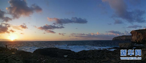 這是3月3日在馬耳他戈佐島拍攝的落日余暉中的“藍窗”舊址。 2017年3月8日,由于大風引起巨浪沖刷,位于馬耳他第二大島戈佐島西北角的著名景點“藍窗”坍塌?!八{窗”坍塌以后,其舊址風光依然吸引著一些游客。 新華社記者 袁韻/攝
