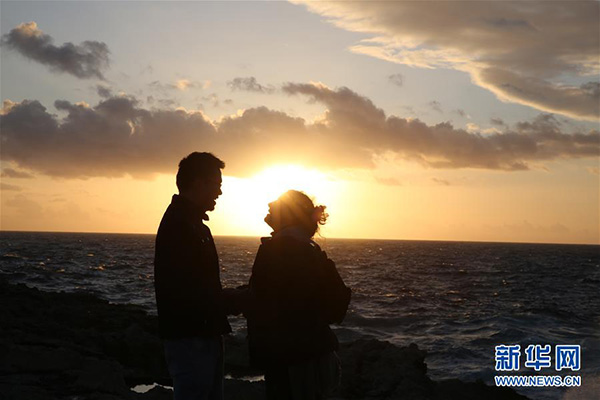 3月3日,在馬耳他戈佐島,兩名游客在“藍窗”舊址欣賞落日美景。 2017年3月8日,由于大風引起巨浪沖刷,位于馬耳他第二大島戈佐島西北角的著名景點“藍窗”坍塌?!八{窗”坍塌以后,其舊址風光依然吸引著一些游客。 新華社記者 袁韻/攝