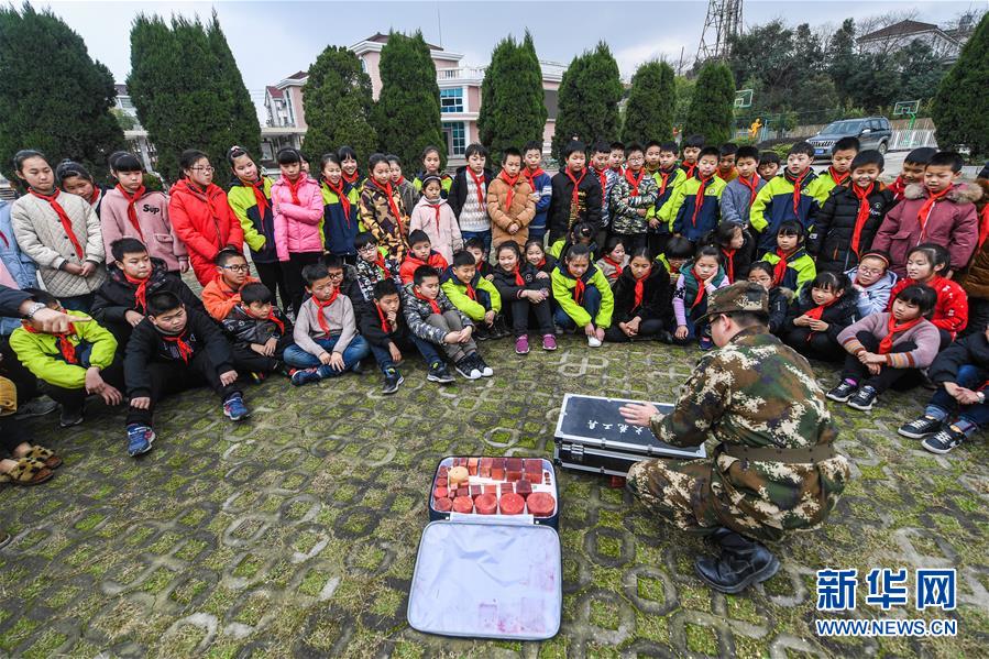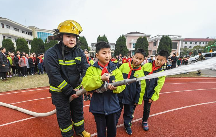 3月6日,東林鎮(zhèn)消防應(yīng)急救援隊(duì)的隊(duì)員帶領(lǐng)小學(xué)生們體驗(yàn)水槍的使用。新華社 記者徐昱/攝