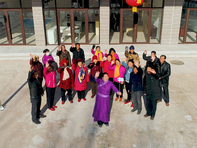 趙會(huì)杰和小廟子村村民站在村黨群活動(dòng)中心前,一起自拍錄視頻。新華社發(fā)(視頻截圖)