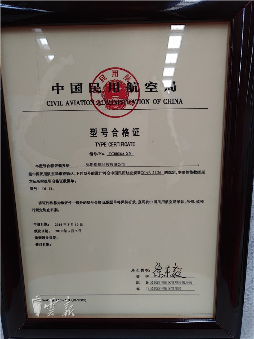 這一天,中國民用航空局為我省DL-2L飛機(jī)頒發(fā)型號合格證(TC)頒證儀式在彌勒市彌陽工業(yè)園舉行。標(biāo)志著DL-2L飛機(jī)通過了型號合格審定,飛機(jī)設(shè)計(jì)滿足保證安全的基本要求,獲得了進(jìn)入市場的通行證,并成為西南地區(qū)首架擁有100%自主知識(shí)產(chǎn)權(quán)并成功取證的輕型運(yùn)動(dòng)類飛機(jī)。