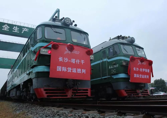 長沙,鐵路貨運(yùn)新北站,滿載電子產(chǎn)品、機(jī)械配件、陶瓷、湘繡、茶葉等商品的“湘歐快列”從這里一路向西,駛往塔什干、明斯克、莫斯科、漢堡、杜伊斯堡……這樣的班列每周都有3-4列。而且2018年6月,“湘歐快線”懷化至明斯克班列也已開通。