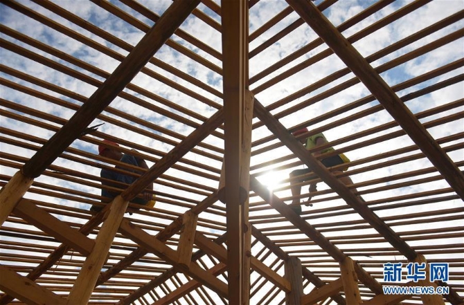 ?在湖北省宣恩縣曉關(guān)侗族鄉(xiāng),工人在建設(shè)吊腳樓(2018年7月26日攝)。2018年,當(dāng)?shù)卣_始修建6座新的侗寨吊腳樓,為符合易地搬遷政策的貧困戶實(shí)施搬遷。新華社發(fā) 王俊/攝
