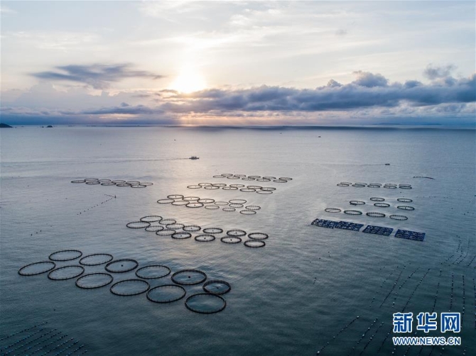 ?夕陽(yáng)映照下的浙江省溫州市平陽(yáng)縣南麂島馬祖岙海域,圓形的都是大黃魚養(yǎng)殖網(wǎng)箱(2018年8月18日無(wú)人機(jī)拍攝)。新華社 記者徐昱/攝