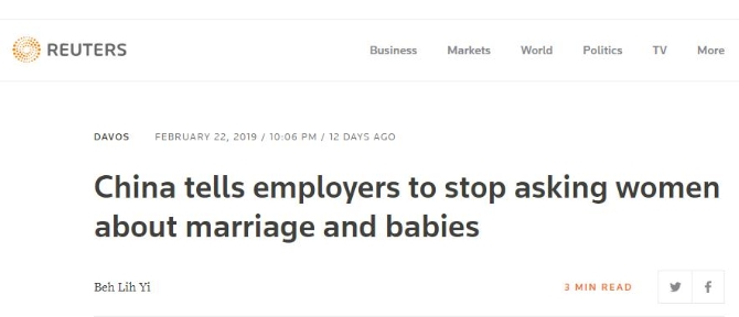 2月22日,英國路透社也報道了此事,稱中國這一新舉措旨在解決就業(yè)歧視,促進(jìn)更多婦女就業(yè)。