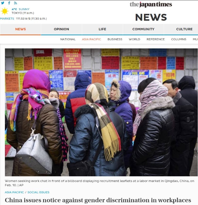 2月10日,《日本時報》網(wǎng)站報道稱,中國日前發(fā)布了禁止就業(yè)性別歧視的通知,規(guī)定了企業(yè)和用人單位不能歧視女員工和前來應(yīng)聘的女性。這一舉措受到了廣泛認(rèn)可和贊同。