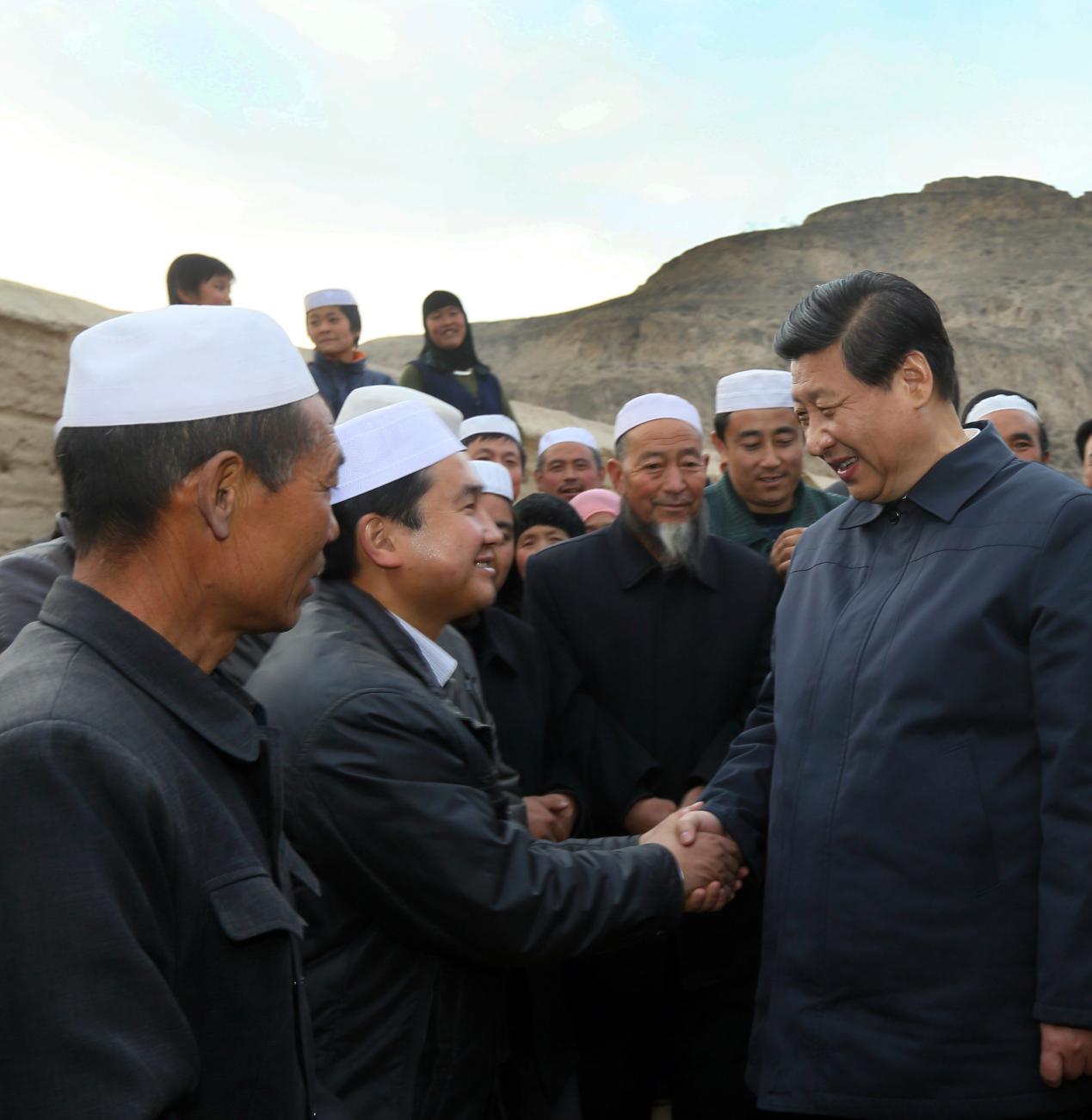 2013年2月3日,習(xí)近平沿著陡峭山路來(lái)到山大溝深的臨夏回族自治州東鄉(xiāng)族自治縣布楞溝村看望東鄉(xiāng)族群眾。圖為習(xí)近平和村民們熱情握手。
