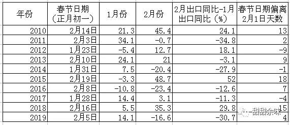 海關(guān)總署2010-2019年前2個月的出口數(shù)據(jù),正好可以印證這一規(guī)律(見下表)。