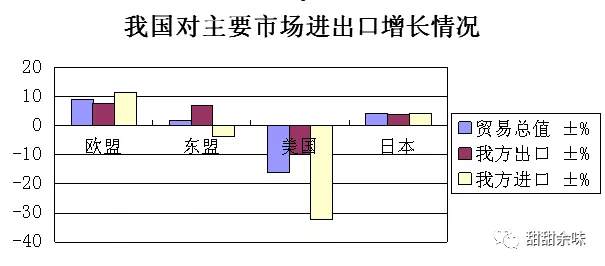 從海關(guān)總署數(shù)據(jù)來看,幾個主要市場,除了中美貿(mào)易總值降幅明顯,與歐盟、東盟、日本總體都有回升,與歐盟及東盟的貿(mào)易總值分別占到我外貿(mào)總值的16.2%、12.8%,都超過了中美貿(mào)易總值的占比11.6%。