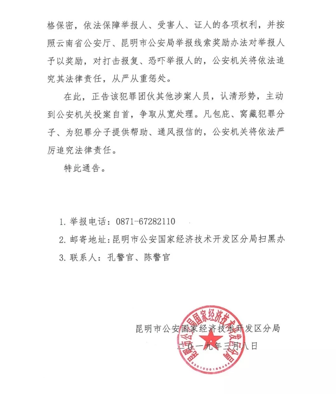 郵寄地址:昆明市公安局國家經(jīng)濟技術(shù)開發(fā)區(qū)分局掃黑辦